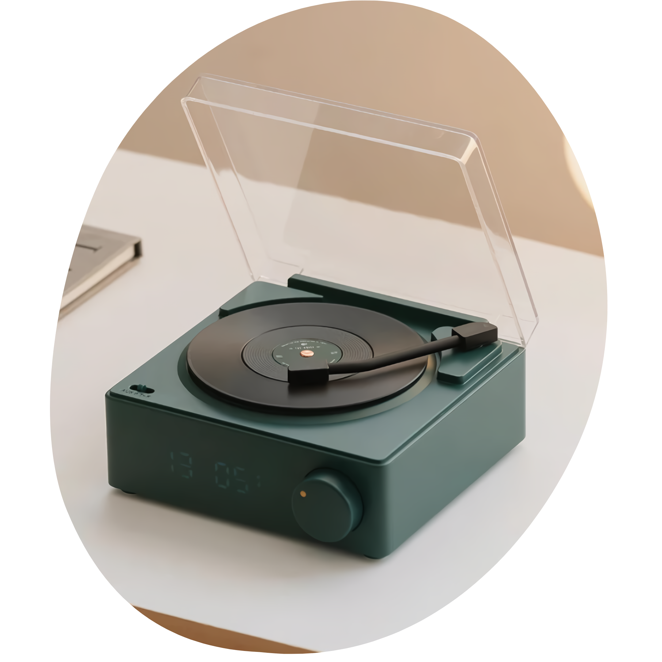 Where nostalgia meets innovation: a Bluetooth speaker that captures the elegance of a vintage record player with the power of today’s wireless sound.